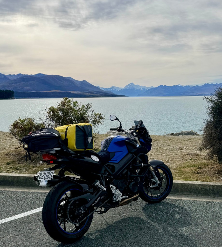 Brians BMW sits in front of Lake Pukaki and Aoraki, Mount Cook in the distance. The cloud had started to roll in turning the lake from a vivid blue to a cold grey.